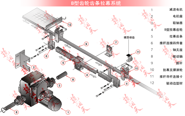 1. 齿轮齿条方式,性能稳定,分为A型与B型,A型齿轮齿条为有速比的驱动系统,较适用于大面积的遮阳网的开启与闭合。